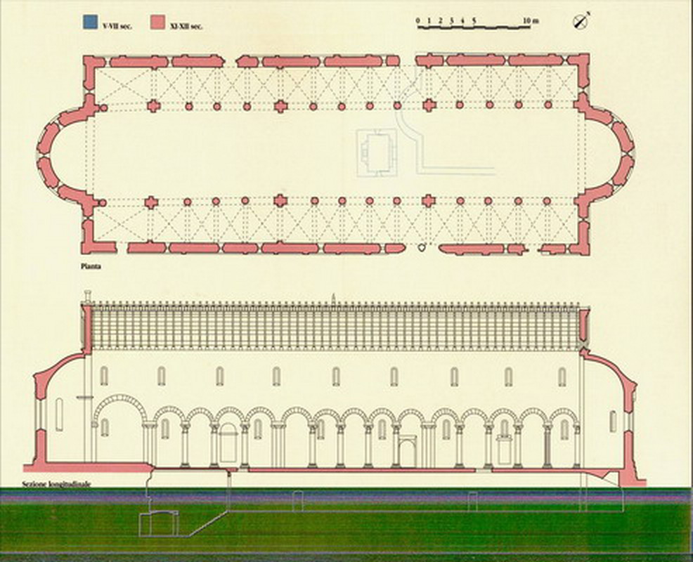 La basilica è frutto, però, di un progetto unitario con pianta a tre navate e absidi contrapposte lungo l’asse nord est – sud ovest, dovuto a “undici maestri architetti, i